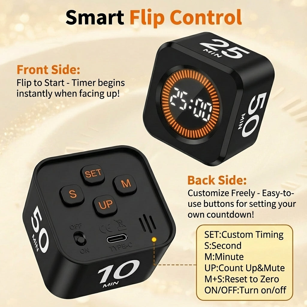 Simply flip and rotate the pomocube to the corresponding face and the gravity orientation sensor begins a timer for 5 minutes, 10 minutes, 25 minutes, or 50 minutes.